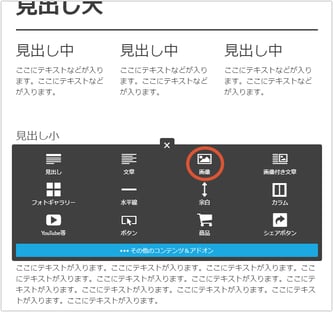 写真を追加したい場所にマウスポインタ―を合わせ[+コンテンツを追加]と表示が出たらクリックしてメニューを展開します。メニューから[画像]をクリックすると、「ここへ画像をドラッグ またはここをクリックして追加」とアップロード画面が現れます。